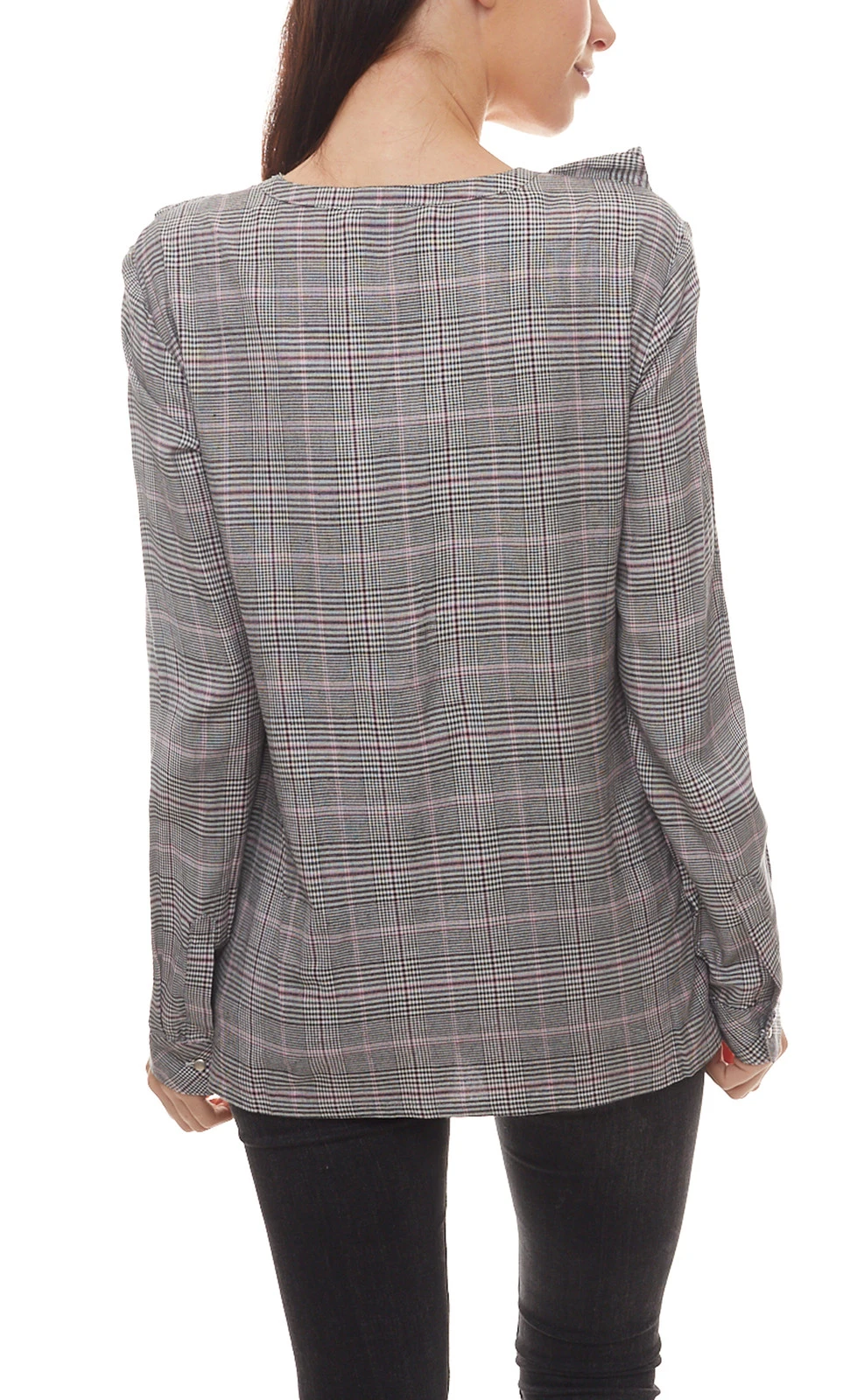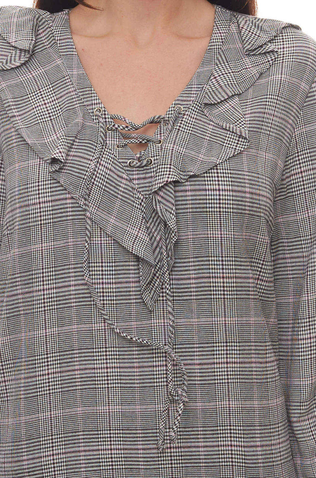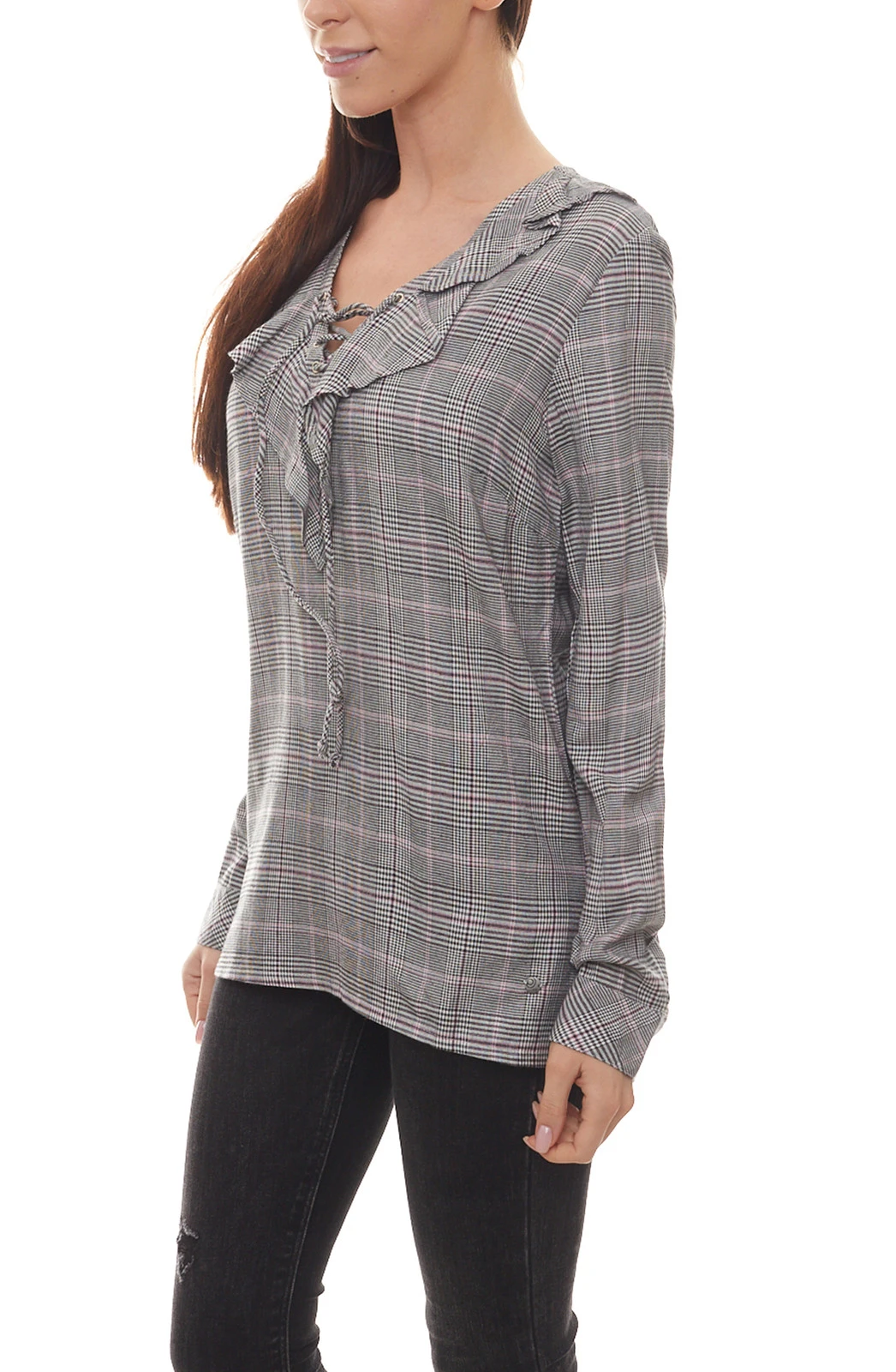 AjC Bluse karierte Damen Shirt mit Rüschen und Schnürung am Ausschnitt Hemd Grau-Schwarz