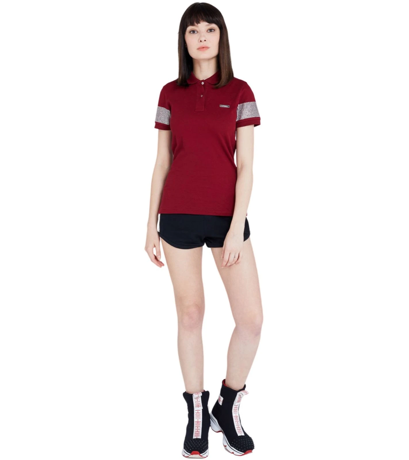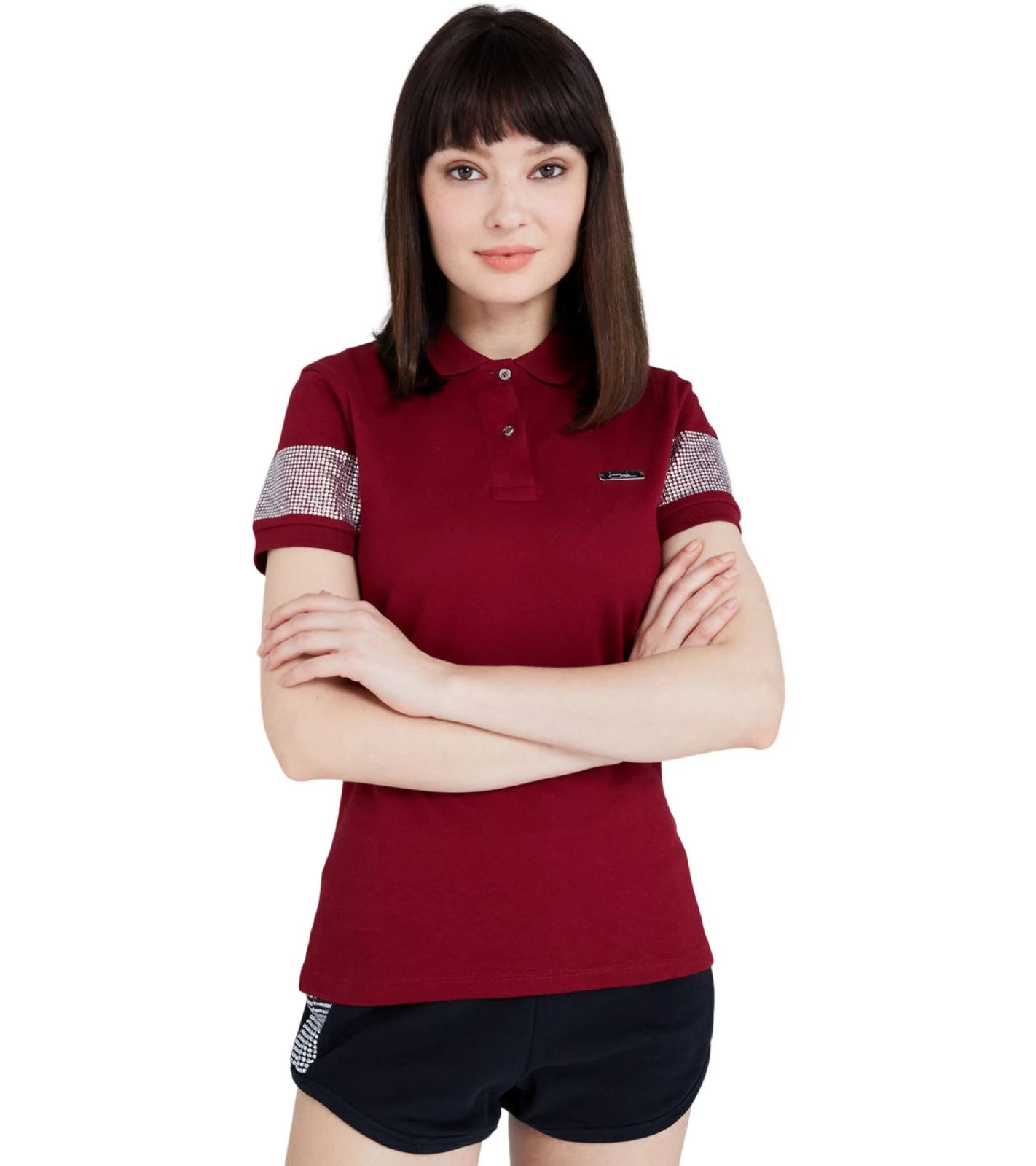 JEREMY MEEKS Damen Polo-Shirt T-Shirt Annamaria mit Glitzersteinen an den Ärmeln Bordeaux