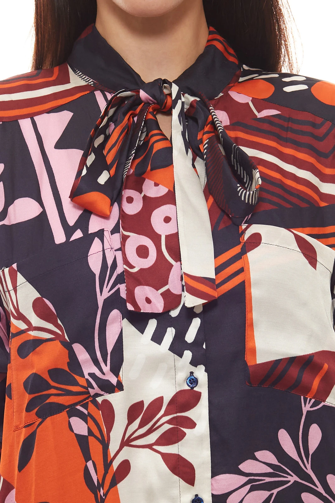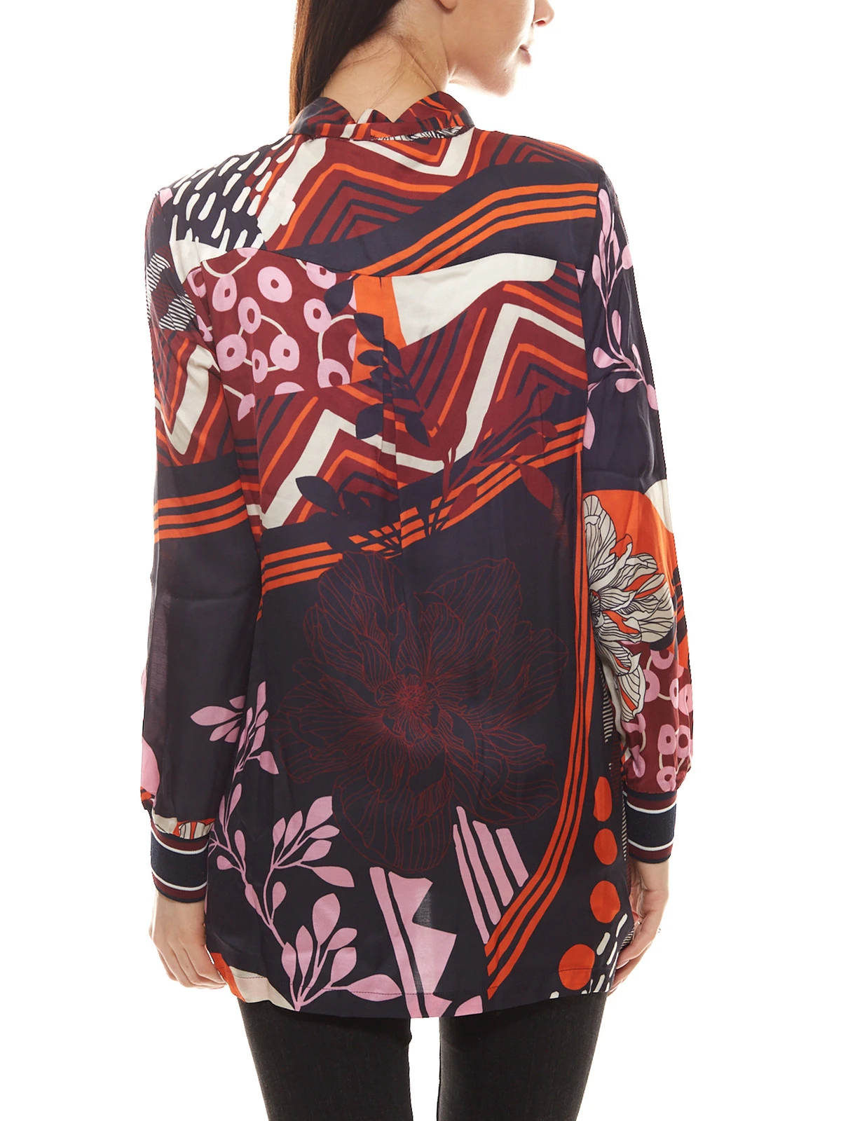 Laurél Bluse stylische Damen Langarm-Bluse in Retromuster und Kragen mit Bindeband Bunt