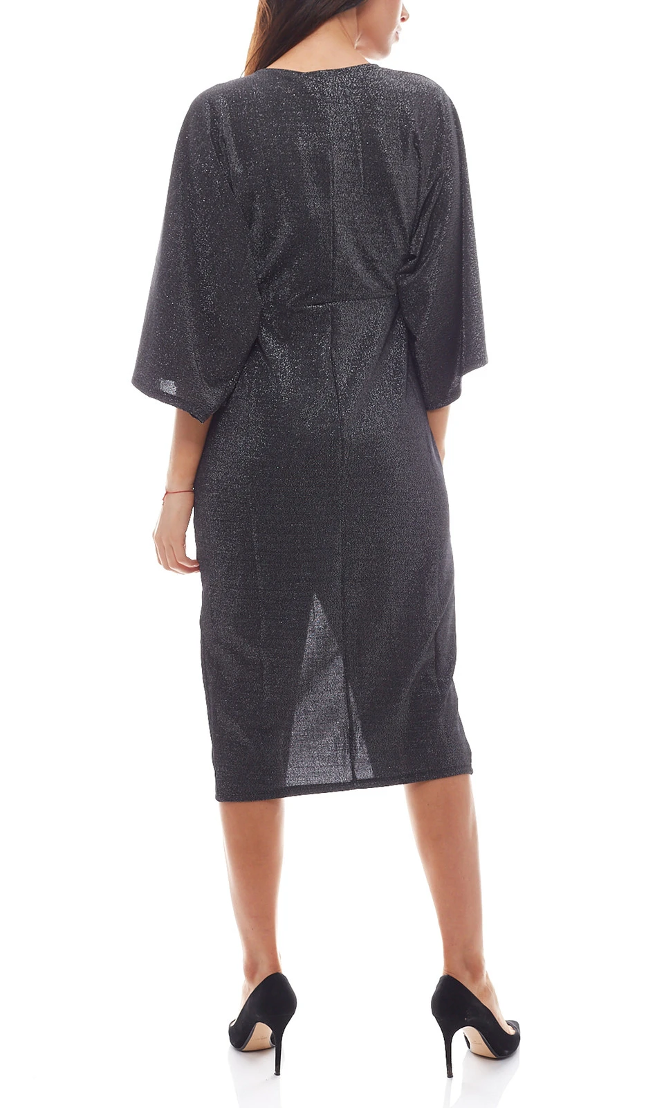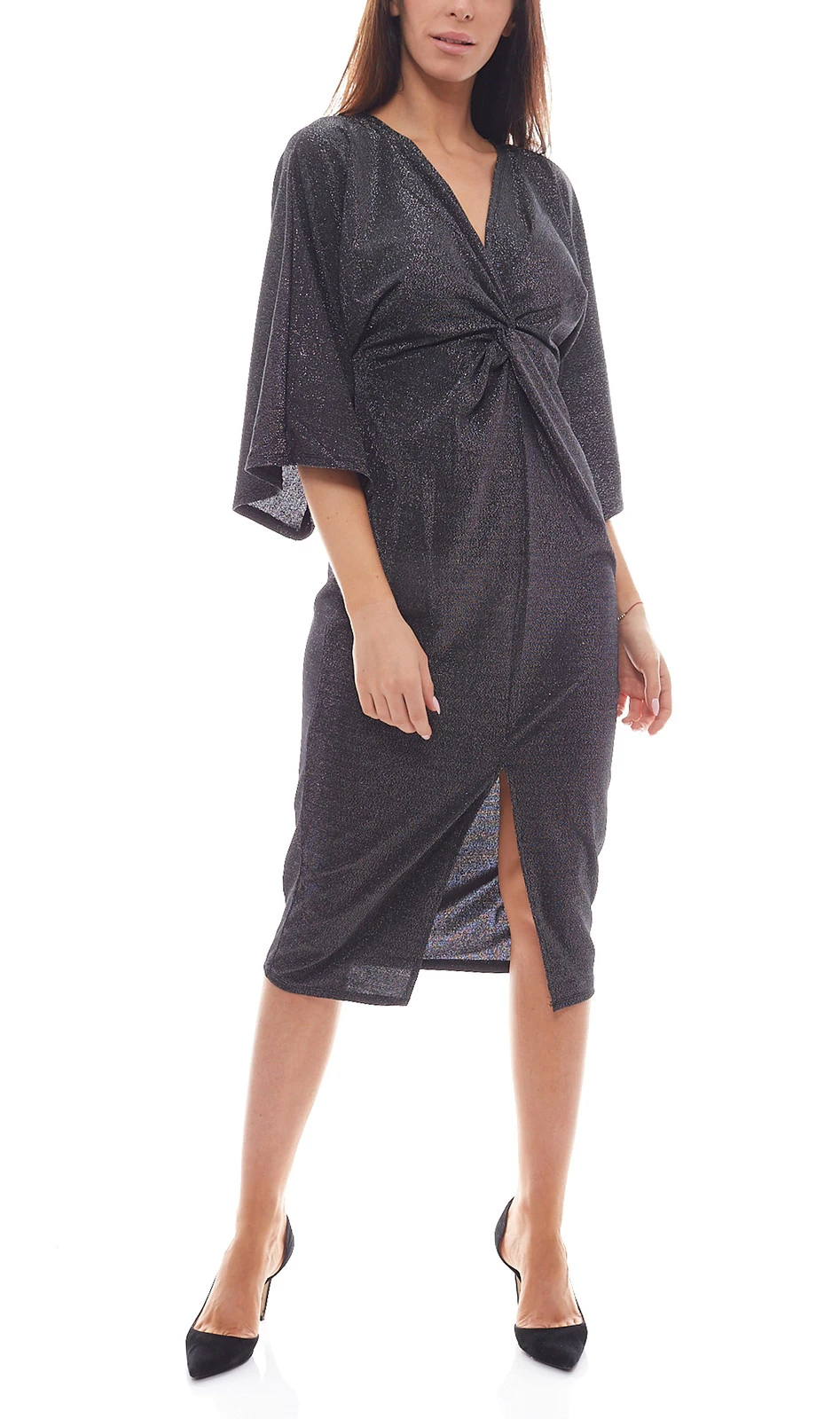 - das Glittery Kimono Slit Dress von Hannalicious x NA-KD verfügt über weite Kimono-Ärmel, ein Twist-Detail auf der Brust, einen Frontschlitz, ein glitzerndes Design und dickes Webmaterial